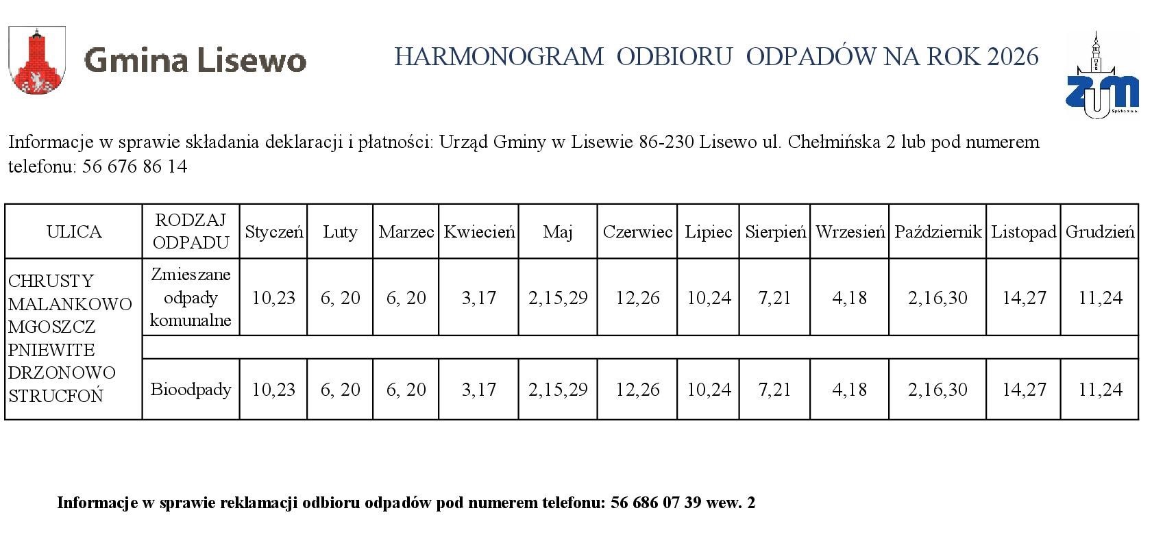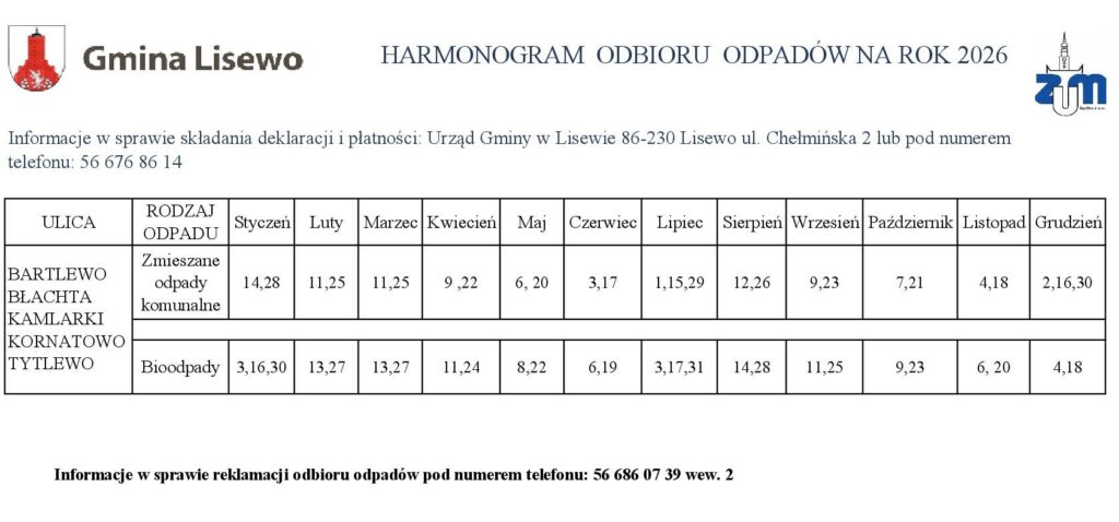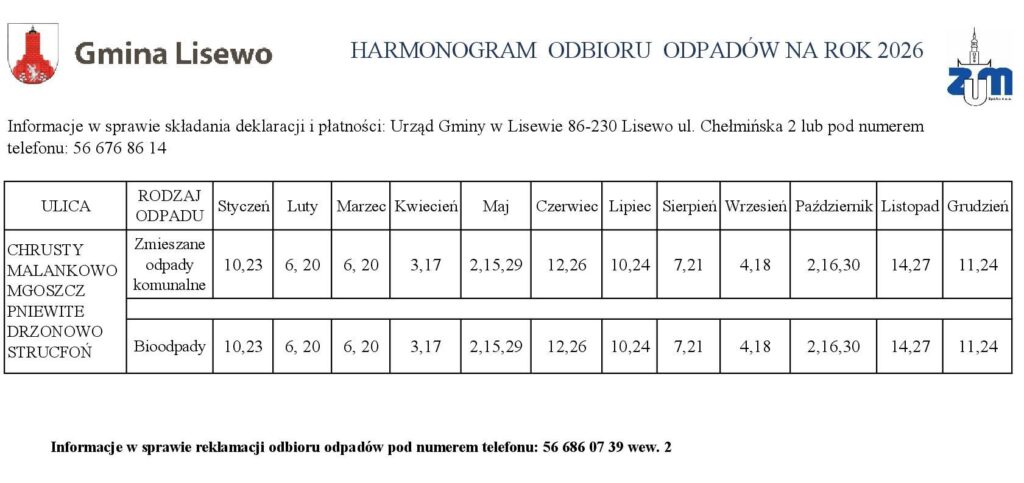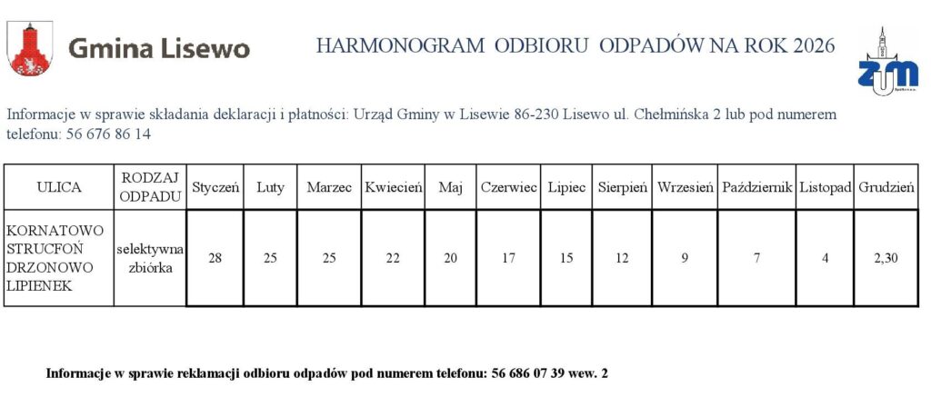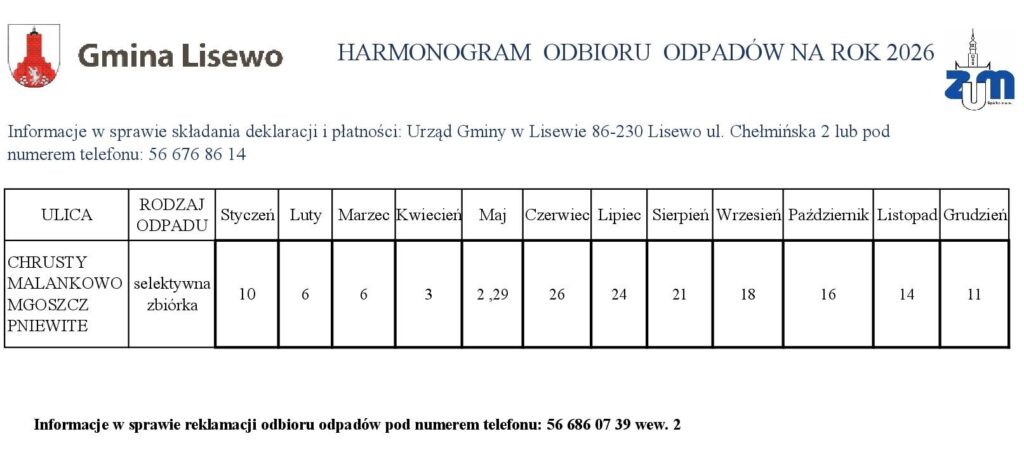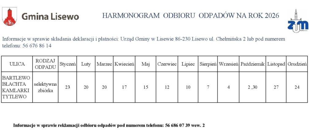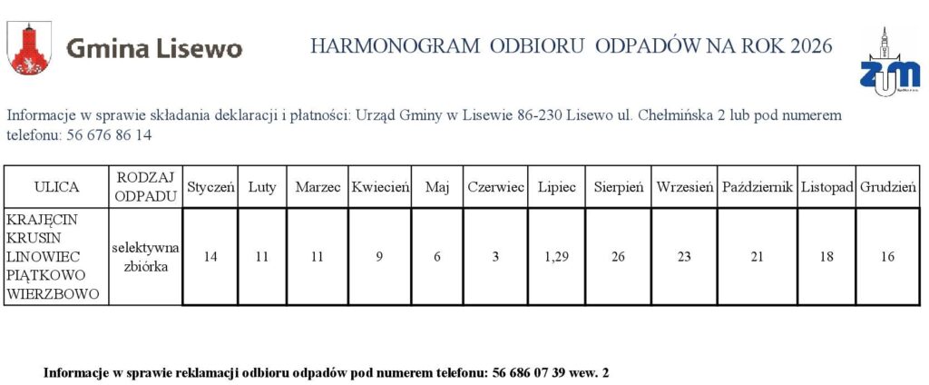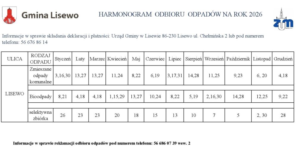 Harmonogram na 2026 rok 31 grudnia 2025 Opublikowano w Ogłoszenie Przedstawiamy Państwu harmonogram odbioru odpadów komunalnych zbieranych selektywnie z terenu Gminy Lisewo w roku 2026. Tweet