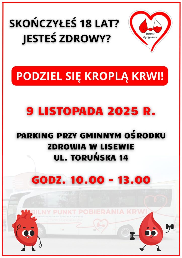 9 listopada 2025 r. (w niedzielę) w godz. od 10.00-13.00 ambulans Regionalnego Centrum Krwiodawstwa i Krwiolecznictwa w Bydgoszczy, w którym można honorowo oddać krew, stanie na parkingu przy Gminnym Ośrodku Zdrowia w Lisewie, ul. Toruńska 14.