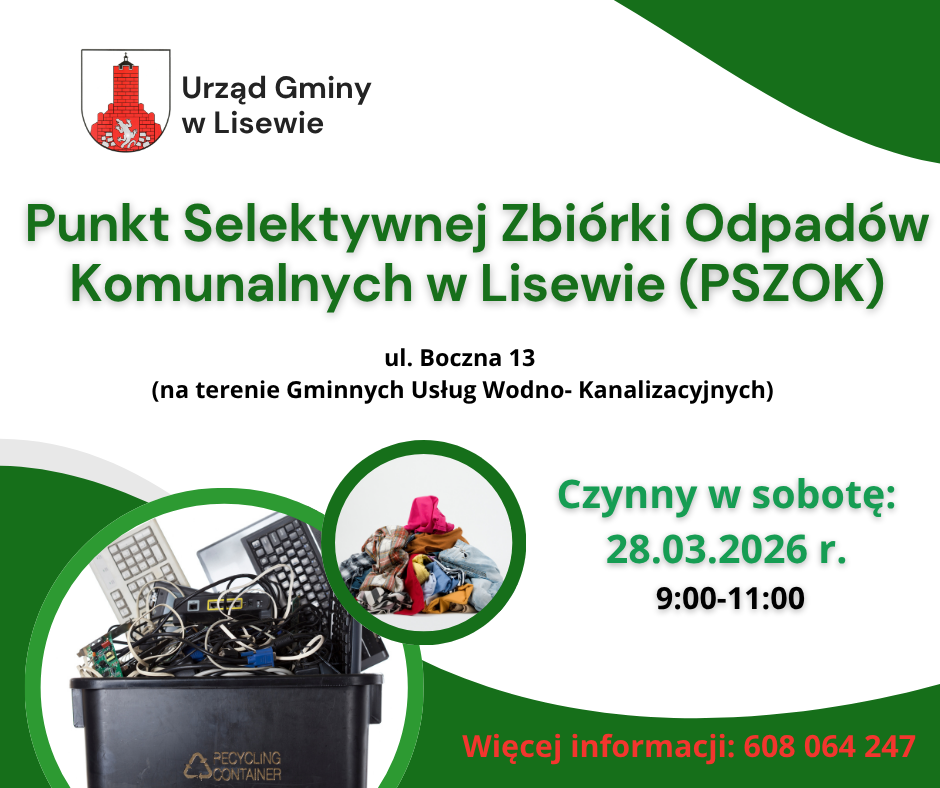 Informujemy, że Punkt Selektywnej Zbiórki Odpadów Komunalnych w Lisewie (PSZOK) ul. Boczna 13 (na terenie Gminnych Usług Wodno- Kanalizacyjnych) będzie czynny w sobotę, 28.03.2026 r. w godzinach 9:00-11:00.