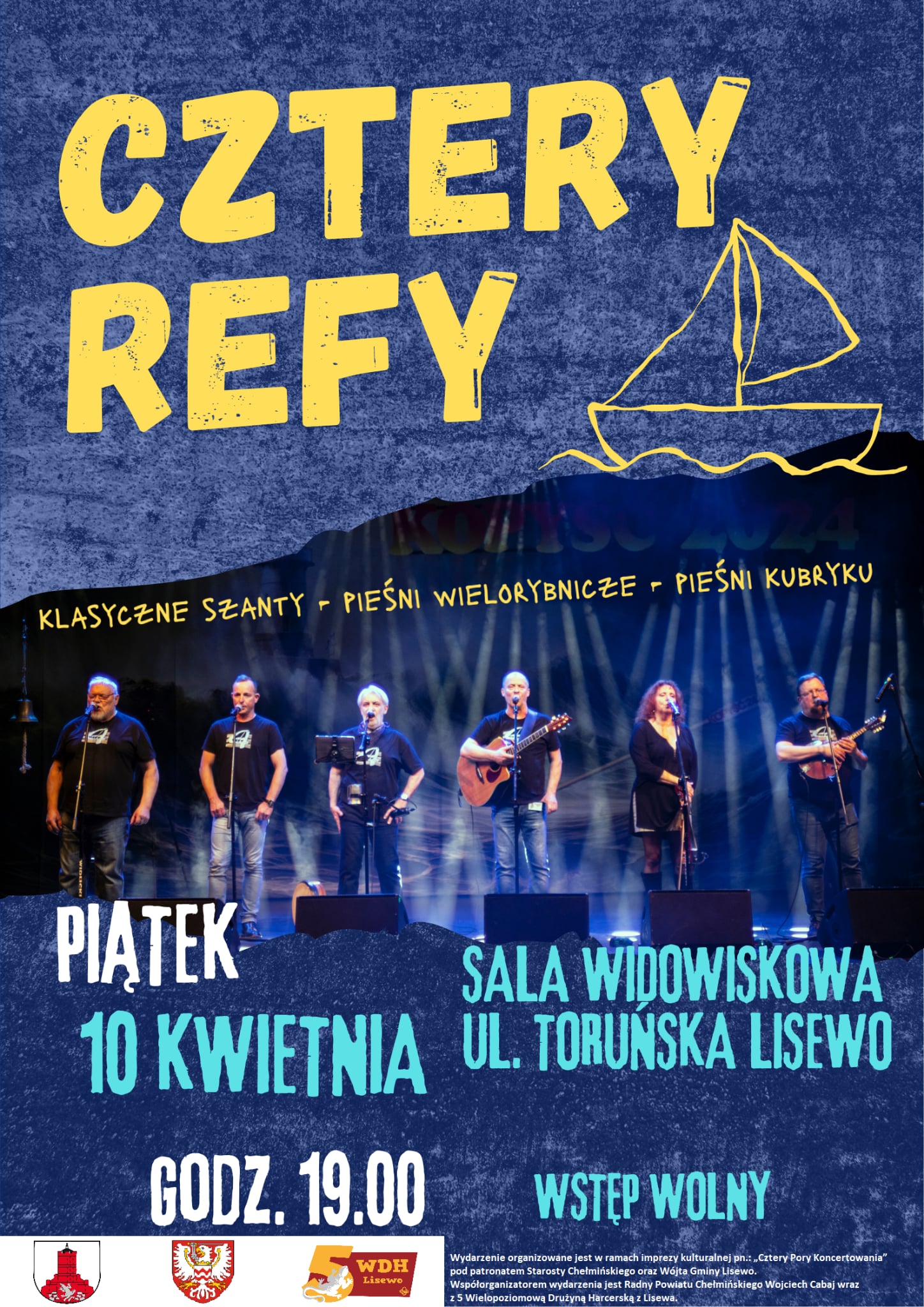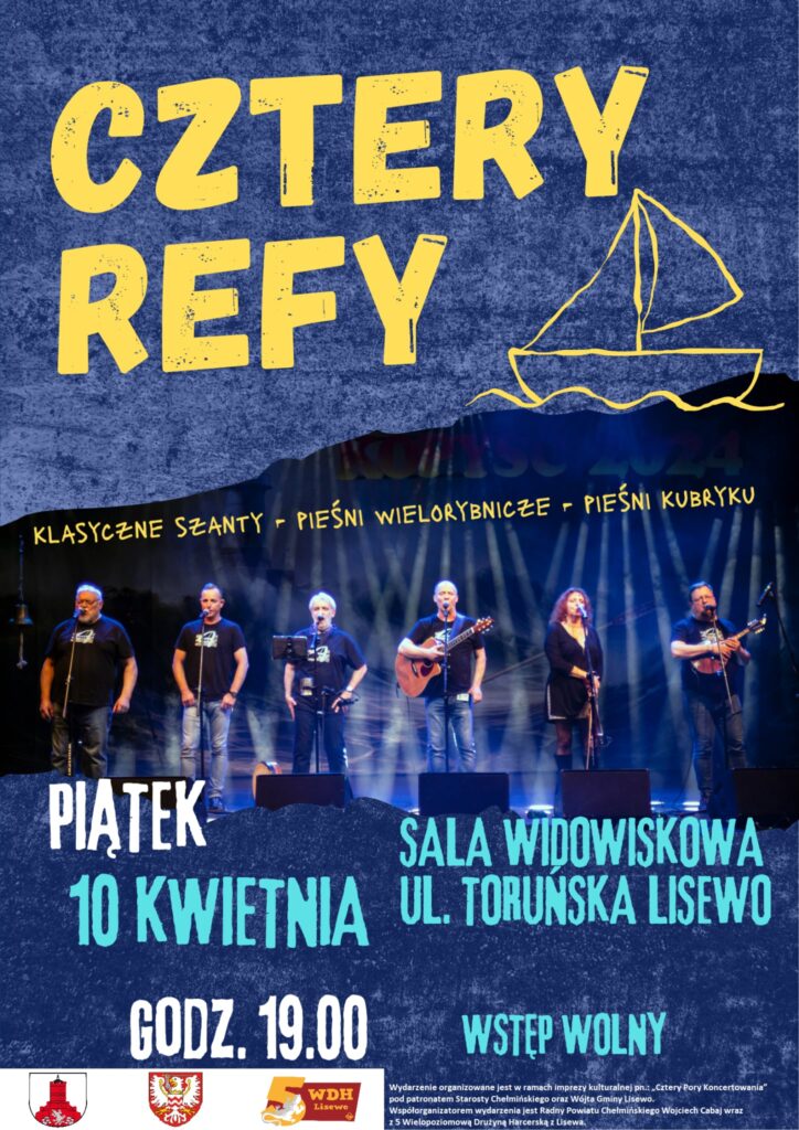 Serdecznie zapraszamy na koncert legendarnego zespołu Cztery Refy!!! 10 kwietnia 2026 r. Start o godzinie 19.00, aula widowiskowa w Lisewie, ul. Toruńska 17.