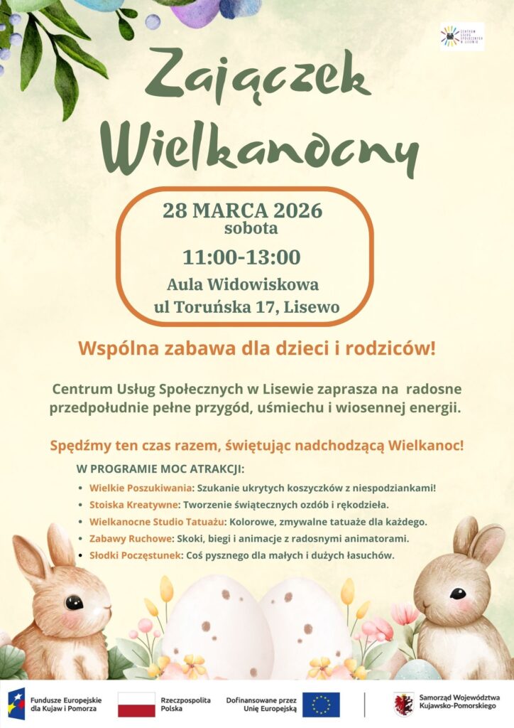 Wspólna zabawa dla dzieci i rodziców! Centrum Usług Społecznych w Lisewie zaprasza na radosne przedpołudnie pełne przygód, uśmiechu i wiosennej energii. Spędźmy ten czas razem, świętując nadchodzącą Wielkanoc!